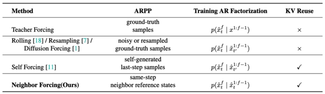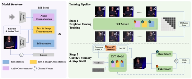 nvKV Memory机制实现性能提升。模型采用按chunk逐段生成的方式,在每个chunk内部通过扩散模型完成细节建模,并通过上下文信息在chunk之间传递,实现连续流式生成。在此基础上,Neighbor Forcing机制通过对齐同一扩散步的相邻帧latent,使模型在训练与推理阶段保持一致的噪声语义空间,从而降低分布不一致带来的误差累积问题。