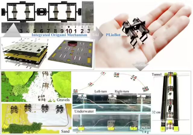 国防科技大学团队 3 月 12 日在《自然》子刊《微系统与纳米工程》上发表了一项关于微型机器人的研究成果。该研究展示了一款名为 PLioBot 的并联腿昆虫级机器人,其重量仅为 1.2 克,比一枚一元硬币更轻,但能够实现在草地、沙地、石堆等多种地形上的移动,并可负重 1.4 克钻过 L 形弯道,同时具备水下活动能力。该机器人的制造方式区别于传统微型机器人的零部件分别加工再组装的方法。研究团队采用五
