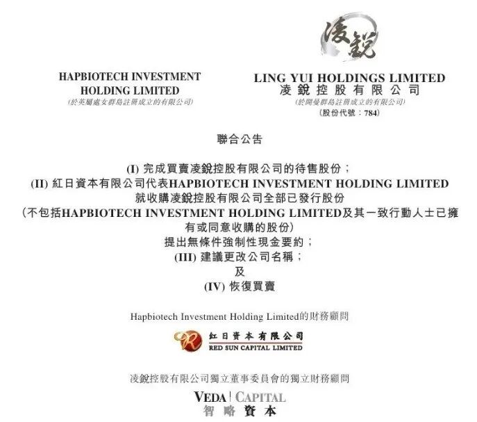 近日,香港上市公司凌锐控股(00784.HK) 发布联合公告,宣布控股股东已完成变更。基因检测解决方案供应商海普洛斯生物科技(Haplox Investment Holding Limited)以约1.33亿港元,收购凌锐控股70.02% 股权,交易已于4月9日完成。根据公告,凌锐控股原主席凌志辉父子及另两名卖方,于4月1日收市后签订买卖协议,合计出售5.6014亿股,占公司已发行股本约70.02