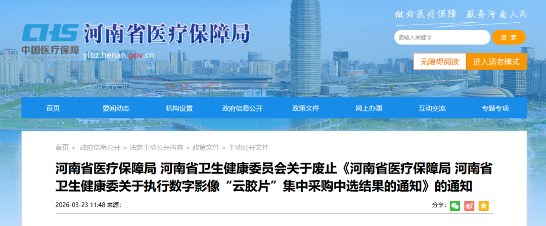 导读:河南云胶片集采中选结果废止 刚刚,河南省医疗保障局发布关于废止《河南省医疗保障局 河南省卫生健康委关于执行数字影像“云胶片”集中采购中选结果的通知》的通知,1类耗材集采结果被废止。图片来源:河南省医疗保障局据通知,根据《公平竞争审查条例》有关规定,按照河南医保局公平竞争审查程序要求,现对《河南省医疗保障局 河南省卫生健康委员会关于执行数字影像“云胶片”集中采购中选结果的通知》(豫医保办﹝20