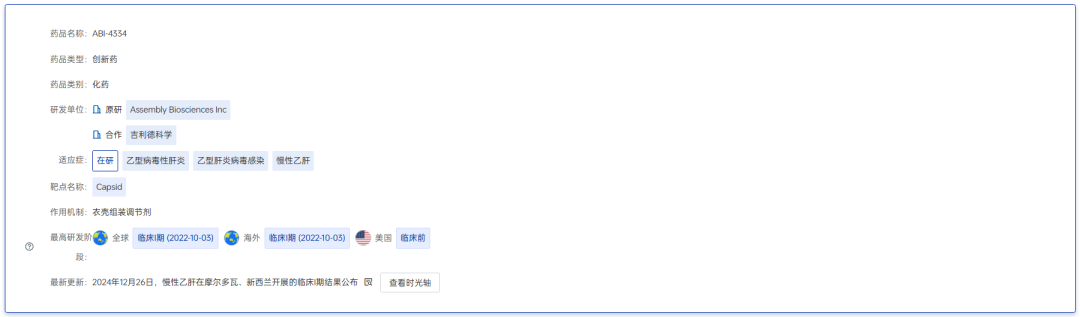 导读:合作变局 近日,吉利德科学正式放弃了一款处于1期临床试验阶段的新型乙肝抗病毒候选药物ABI-4334的开发权,将其全部权益退回至原研企业Assembly Biosciences。ABI-4334的研发历程始于Assembly Biosciences,这是一款下一代衣壳组装调节剂,核心作用机制是抑制乙肝病毒前基因组RNA的衣壳化,并破坏进入肝细胞的衣壳,从而阻止共价闭合环状DNA(cccDNA