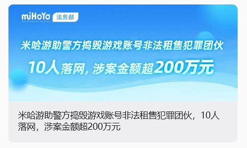 IT之家 4 月 10 日消息,据米哈游法务部今日消息,米哈游在日常监测中发现,某电商平台店铺“青木鱼游戏专营店”“鲨鱼网游专营店”存在游戏账号非法租售行为,涉及《原神》《崩坏:星穹铁道》《绝区零》等多款游戏。在固定证据后,米哈游随即向上海徐汇警方报案。经警方调查,上述店铺背后隐藏着一个从事游戏账号非法租售黑灰产的犯罪团伙,该团伙通过非法渠道获取万余条公民个人信息,并利用这些信息批量注册游戏账号,