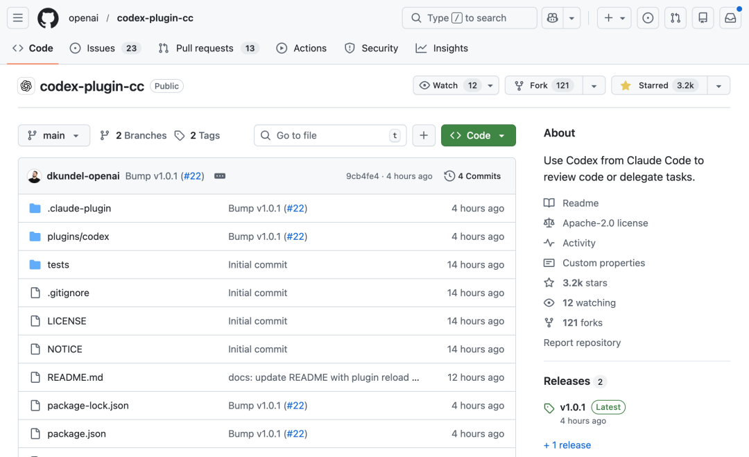 PRODUCT今天 OpenAI 在 GitHub 上线了 codex-plugin-cc,一个专门给 Claude Code 用户的 Codex 插件,Apache-2.0 协议开源截至发稿,半天时间 3.2k starscodex-plugin-cc GitHub 页面cc,就是 Claude Code 的缩写装好之后,你在 Claude Code 里会多出七个斜杠命令,覆盖代码审查、对抗式审