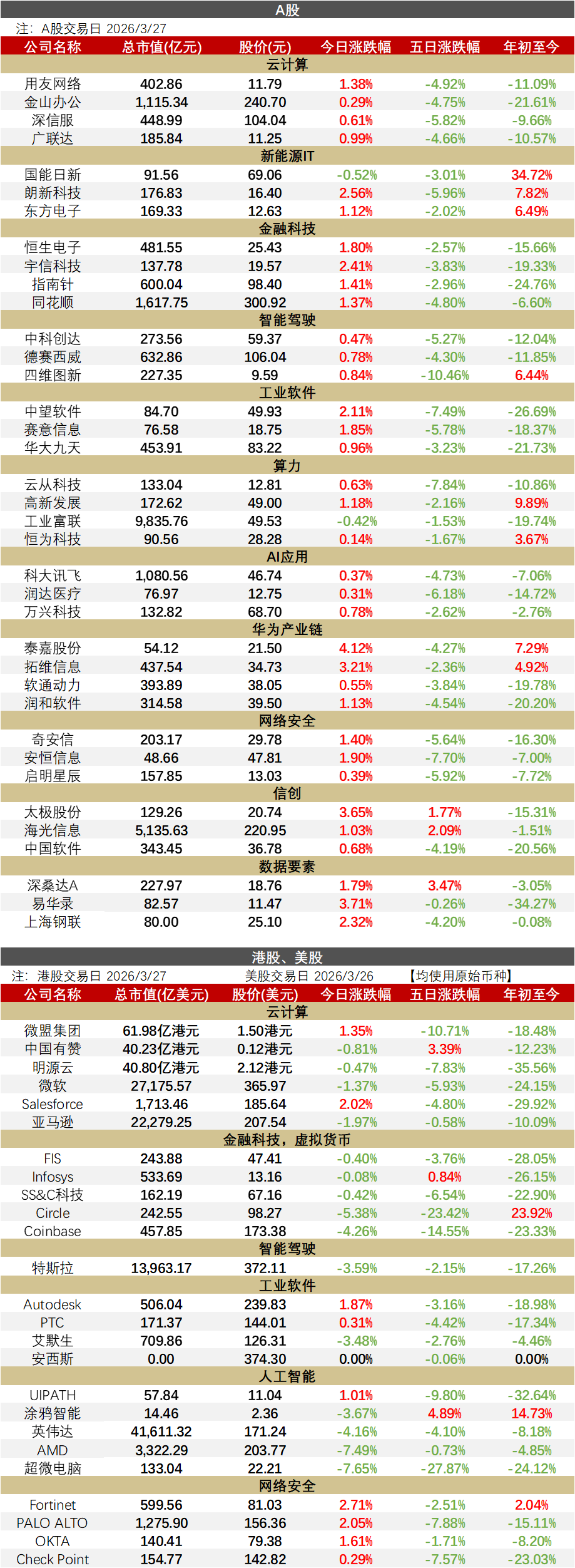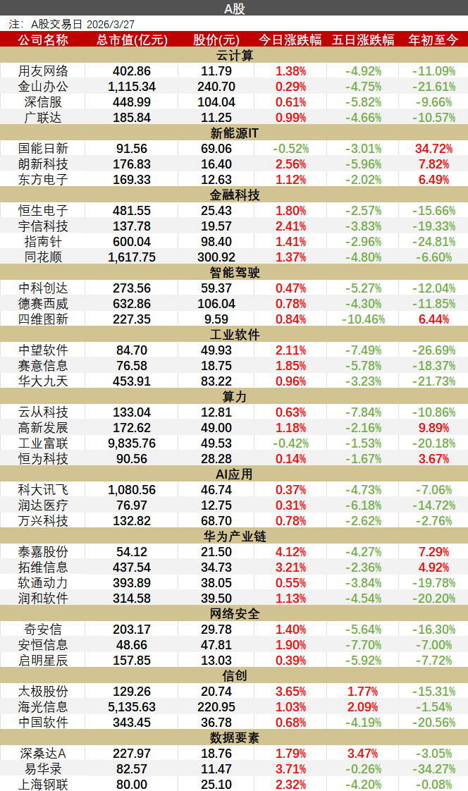 今日行情国内行业要闻► 国家人工智能应用上海中试基地:发布五大核心创新成果国家人工智能应用上海中试基地3月28日在复旦大学附属中山医院举行阶段性成果总结发布会,发布五大核心创新成果与9款医疗智能应用,有力推进我国“人工智能+医疗”高质量发展,是落实国家战略、打造全球医学AI应用高地的关键载体,推动医疗AI从单点突破迈向系统集成。(来源:财联社)► 华为申请基于数据流图进行计算专利,提高数据流微处理