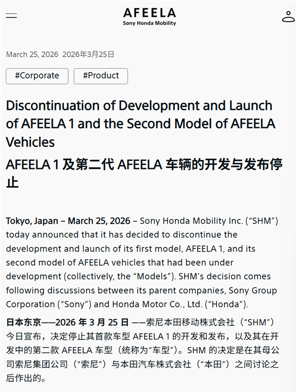 大家还记得索尼和本田联合造车这件事吧。不记得啊?那没事了,这车反正也g了。。。就在前两天,索尼和本田一起发了个声明,双方决定停止首款车型AFEELA 1的发布,还在开发的第二款车型也胎死腹中。事发确实有些突然,毕竟AFEELA 1这车已经亮相很久了,并且去年1月,就在加州开启了预订。按计划今年就会上市交付。一堆交了钱的车主,都满心欢喜等着马上提车呢。这下好了,赶紧去看别的车吧。官方也是说了,将全额