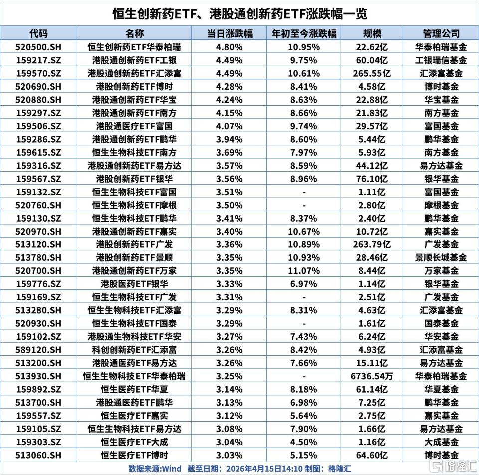 政策利好叠加市场风险偏好回升,恒生创新药ETF华泰柏瑞、港股通创新药ETF工银、港股通创新药ETF汇添富、港股创新药ETF博时、港股通创新药ETF华宝、港股通创新药ETF南方、港股通医疗ETF富国涨超4%;港股通创新药ETF鹏华、恒生生物科技ETF南方、港股通创新药ETF易方达、港股创新药ETF银华、恒生生物科技ETF富国、恒生生物科技ETF摩根涨超3.5%。消息面上,4月14日,国务院办公厅印发