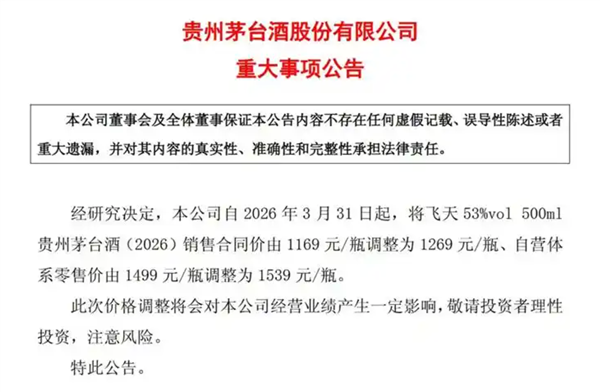新浪财经“酒价内参”重磅上线 知名白酒真实市场价尽在掌握 3月30日,贵州茅台发布重磅消息:自3月31日起,将飞天53%vol 500ml贵州茅台的经销商合同价由1169元提到1269元,自营零售价由1499元提到1539元。虽然只涨了100元和40元,但这是时隔八年后,茅台官方零售价首次上调。在行业整体承压、消费预期谨慎的当下,茅台为何敢于逆势提价?茅台近期频频落子,如果连起来看反映了其怎样的战