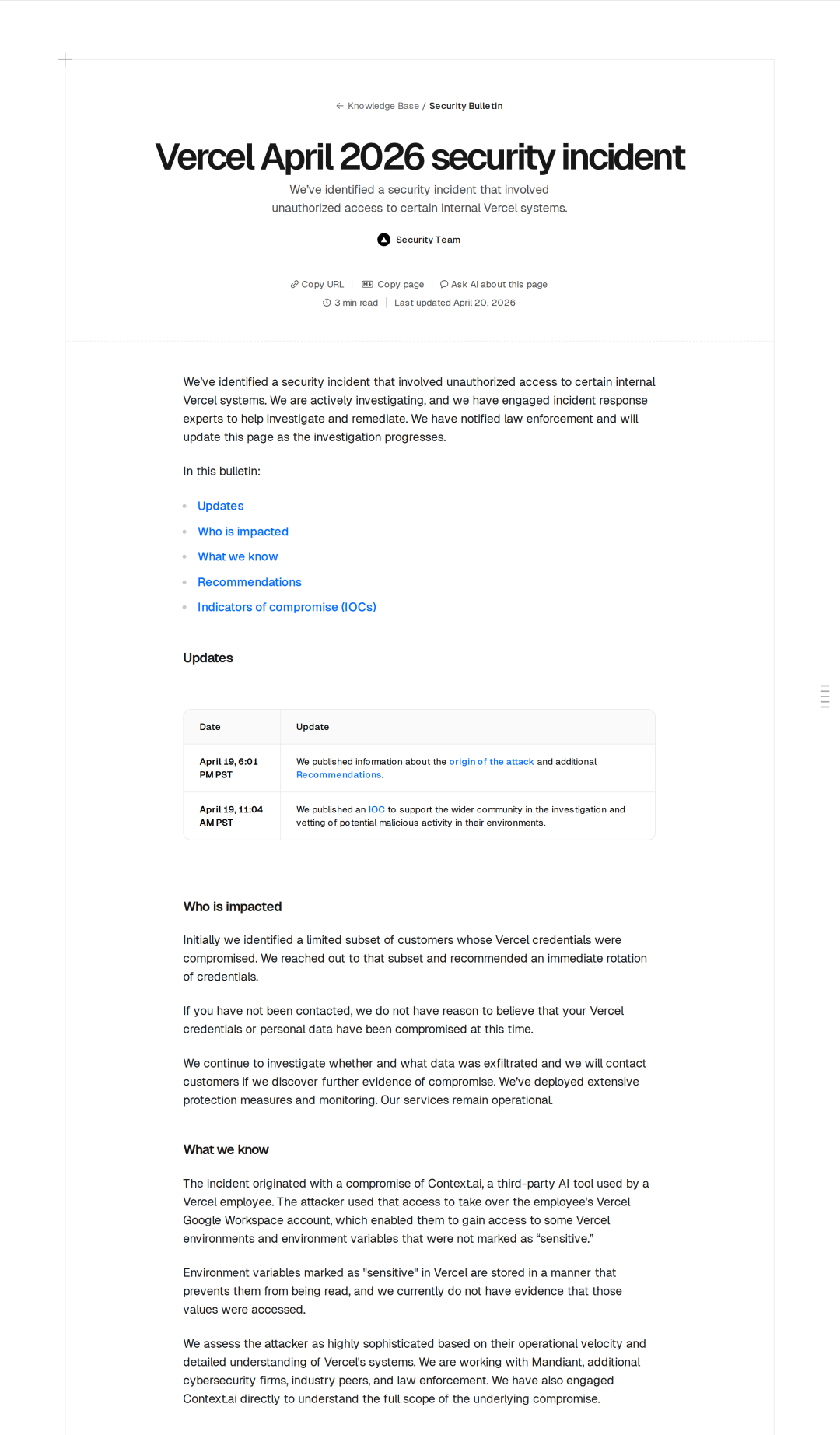 REPORT 4 月 19 日,Vercel 发了一份 1 分钟读完的安全公告。地址:vercel.com/kb/bulletin/vercel-april-2026-security-incident 措辞克制,没有时间线,没有点名攻击者 但同一天凌晨 2:02,BreachForums 上有人开始叫卖 Vercel 数据。这是一个数据黑市论坛,自称 ShinyHunters 的卖家声称手里有