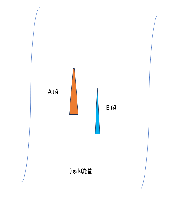 李勇老师微信 13697601072两条船同向航行,在浅水航道会遇,可能速度差不多,也可能是追越状态。如下图所示:这种情况,不管是A船还是B船,都要十分加小心,因为非常容易发生碰撞事故。技术上,就是船吸作用;业务上,就是离得太近或者开得太快。浅水航道,一般两边都是浅滩,对于船舶尤其是大船来说,可航水域就比较窄。而且这种情况还挺常见的。浅水航道中航行的船,自然就会产生浅水效应,就是船底距离海底比较近