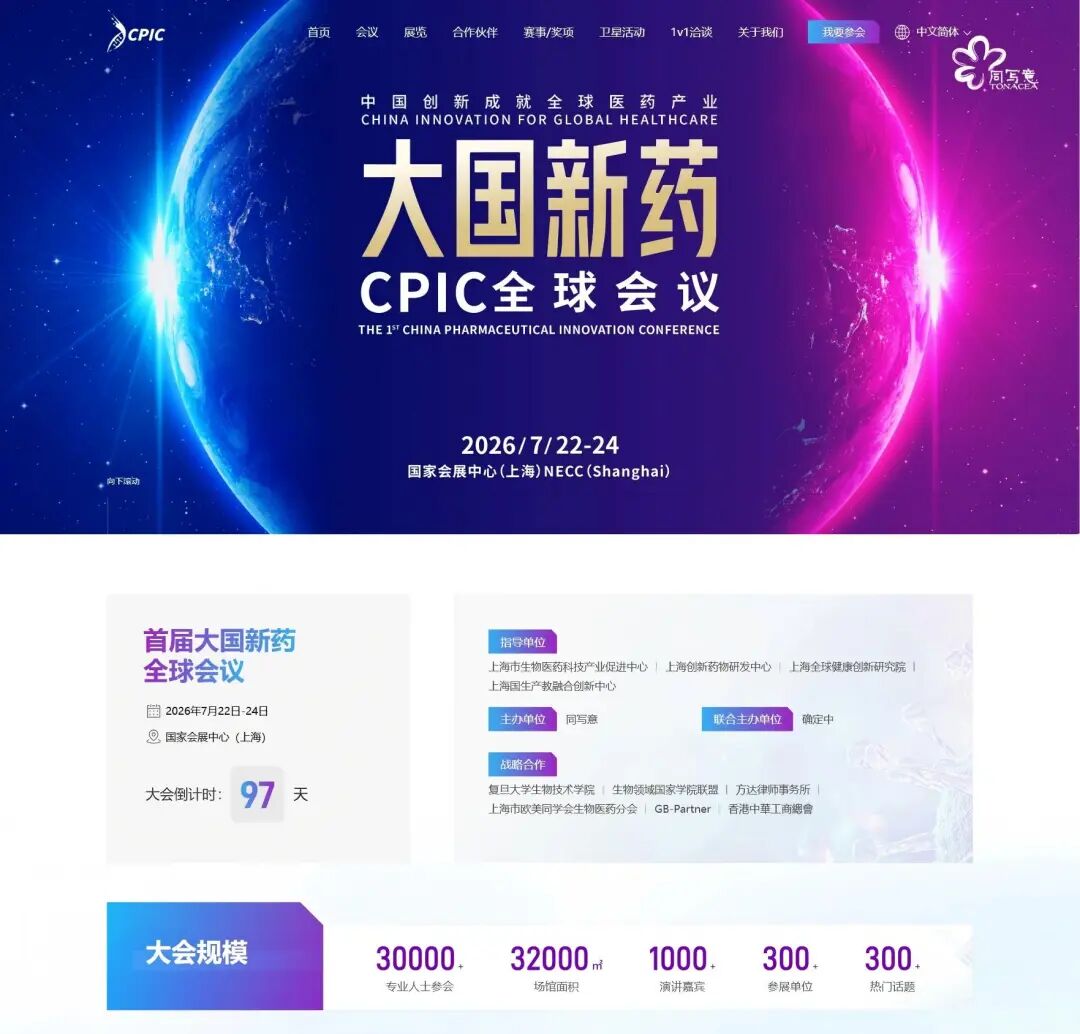 万众期待,如约而至。今日,2026首届大国新药全球会议官方网站正式上线!即日起,登录大会官网,即可一站式获取大会全部信息——从组织框架、会议日程、嘉宾阵容,到1v1预约洽谈、参展/参会报名、合作伙伴,所有您想了解的,这里都有答案。官网地址:www.cpic-shanghai.com(支持中英文双语切换,全球访问无障碍)01.大会全景,一目了然官网首页汇聚大会核心信息:时间地点、组织架构、规模数据、