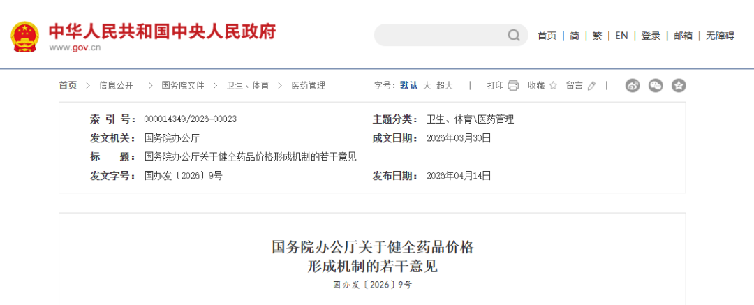 图源:中国政府网截图国务院办公厅关于健全药品价格形成机制的若干意见国办发〔2026〕9号各省、自治区、直辖市人民政府,国务院各部委、各直属机构:为贯彻落实党中央、国务院决策部署,进一步健全药品价格形成机制,经国务院同意,现提出以下意见。一、总体要求以习近平新时代中国特色社会主义思想为指导,深入贯彻党的二十大和二十届历次全会精神,坚持以人民为中心的发展思想,充分发挥市场在资源配置中的决定性作用,更好