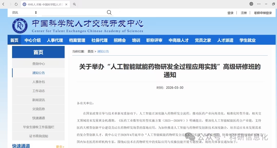 各有关单位: 在国家政策引导与技术革新双重驱动下,人工智能正深度融入药物研发全流程,推动医药产业向高效化、精准化转型升级,相关交叉领域迎来发展黄金机遇期。《医药工业数智化转型实施方案(2025—2030年)》明确提出,要深化人工智能赋能医药全产业链,支持医药大模型创新平台建设及AI在药物研发场景的落地应用。为加快推进人工智能与药物研发创新技术深度融合,培养适应未来发展需求的复合型创新人才,我中心定