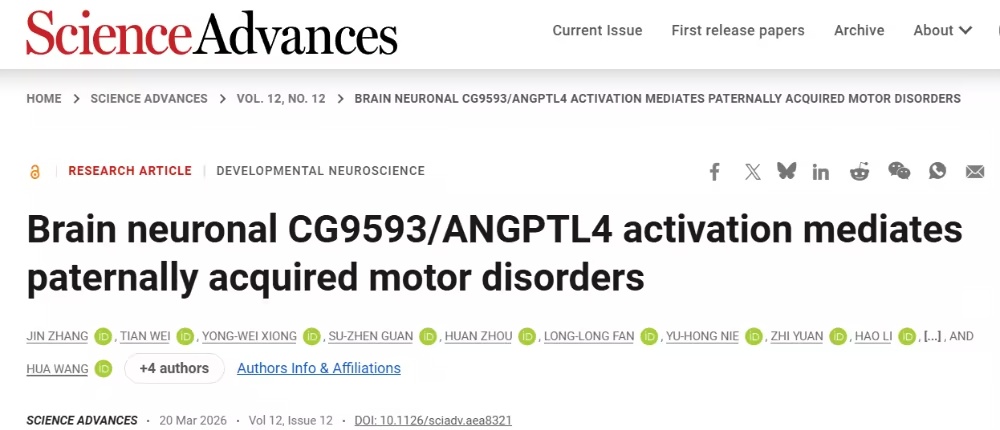 近年来,父系起源的视角逐渐受到关注,但其在运动障碍中的作用尚不明确。 2026年3月20日,安徽医科大学王华独立通讯在Science Advances 在线发表题为Brain neuronal CG9593/ANGPTL4 activation mediates paternally acquired motor disorders的研究论文。 该研究利用果蝇和小鼠模型,证实父代经历环境因素重金属