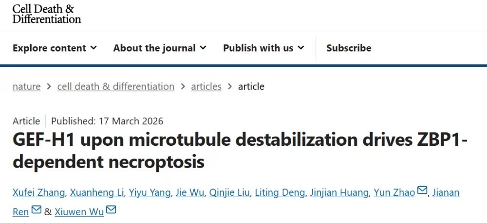 微管相关蛋白或信号通路在坏死性凋亡中的作用尚不明确。 2026年3月17日,东南大学吴秀文,任建安和南京医科大学Yun Zhao共同通讯在Cell Death & Differentiation 在线发表题为GEF-H1 upon microtubule destabilization drives ZBP1-dependent necroptosis的研究论文。该研究通过使用细胞骨架化合物库进行