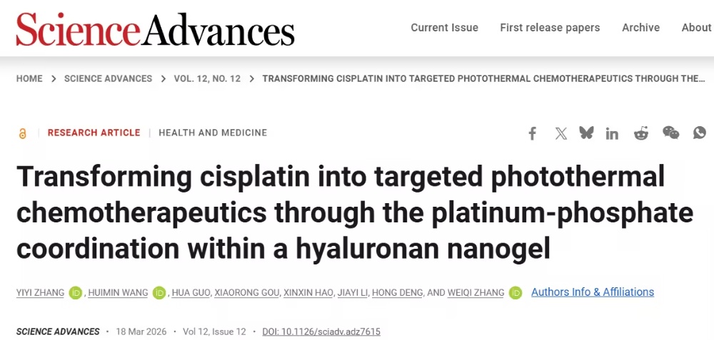 顺铂(Cis)的抗肿瘤疗效因其非特异性组织分布导致的剂量依赖性毒性而受限。虽然靶向递送顺铂及联合疗法可提升治疗效果,但开发多功能且结构简化的制剂仍具挑战。 2026年3月18日,中国医学科学院北京协和医学院张卫奇独立通讯在Science Advances 在线发表题为Transforming cisplatin into targeted photothermal chemotherapeutic
