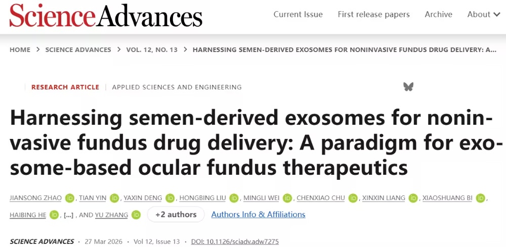 尽管外泌体作为跨越生物屏障的药物载体前景广阔,但其在无创眼后段递送方面的应用仍待深入探索。 2026年3月27日,沈阳药科大学张宇独立通讯在Science Advances 在线发表题为Harnessing semen-derived exosomes for noninvasive fundus drug delivery: A paradigm for exosome-based ocular