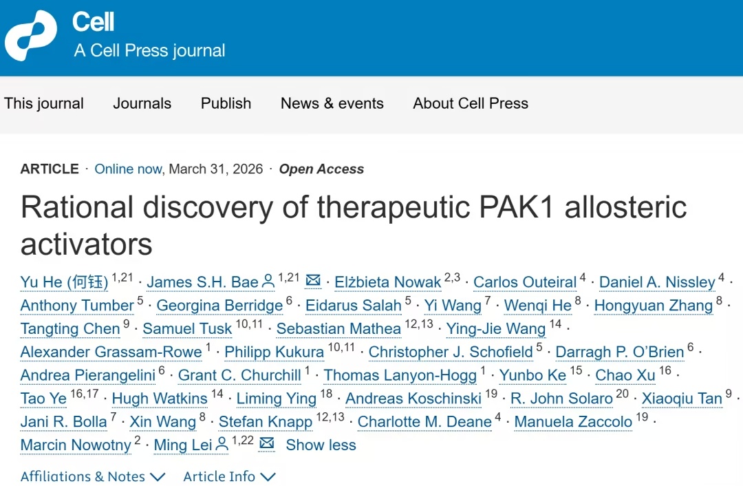 尽管激酶激活剂具有显著的治疗潜力,但其开发仍面临巨大挑战,且很少能够成功实现。 2026年3月31日,牛津大学雷鸣团队(何钰为第一作者)在Cell在线发表题为Rational discovery of therapeutic PAK1 allosteric activators的研究论文,该研究报告了利用基于合理肽引导策略发现 p21 激活激酶-1(PAK1)直接小分子激活剂的成果,PAK1 是心