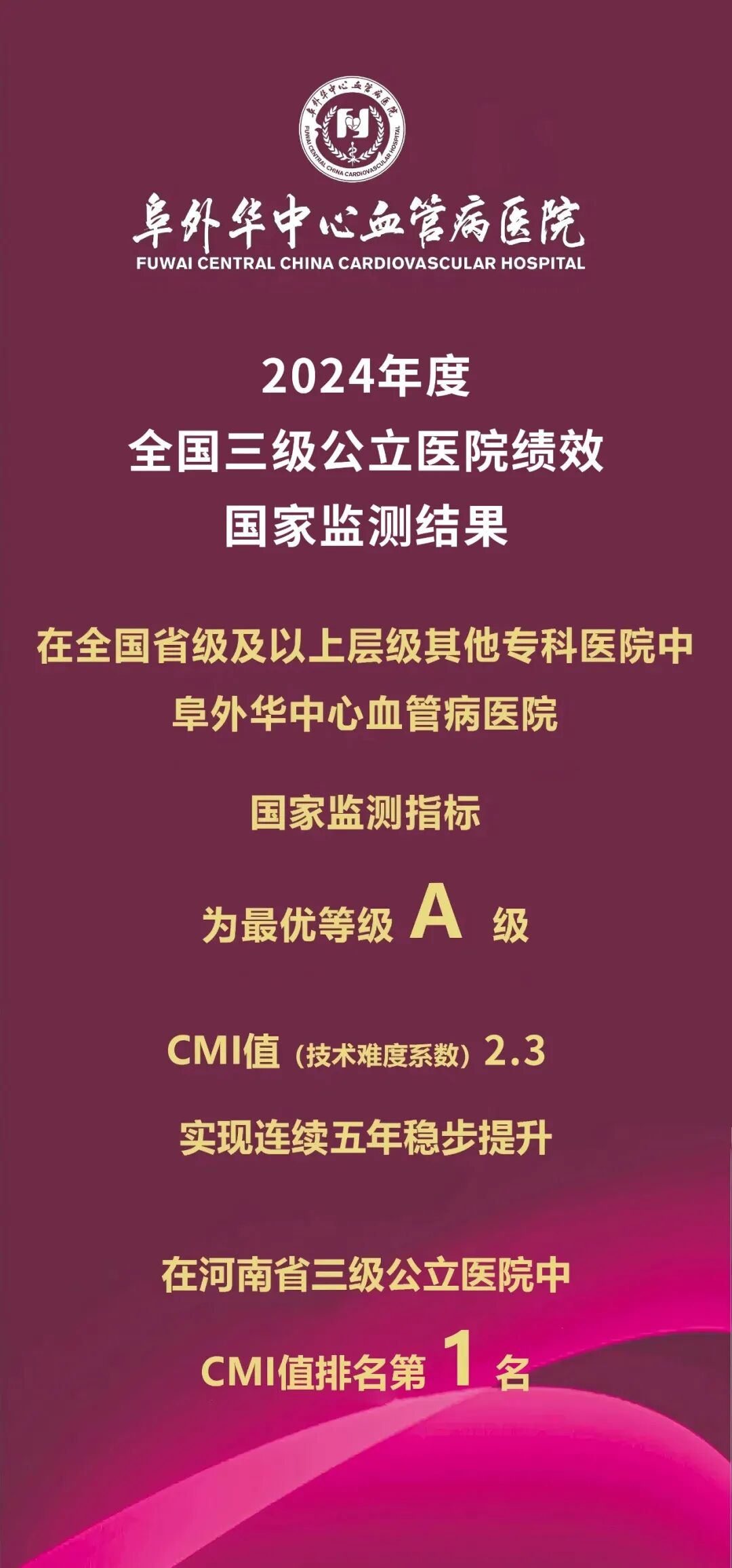 近日,2024年度国家三级公立医院绩效监测结果正式公布,阜外华中心血管病医院再获历史性突破:在全国省级及以上其他专科医院中阜外华中心血管病医院国家监测指标获评最优等级A级CMI值(技术难度系数)2.3实现连续五年稳步攀升同时稳居河南省三级公立医院排名第1国家三级公立医院绩效监测(简称“国考”)是由国家卫生健康委、国家中医药局牵头组织,覆盖全国各级公立医院的国家级、权威性、强制性综合评价体系,以医疗