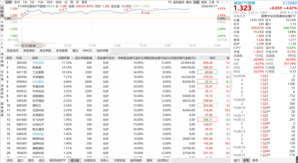 光模块今日强势上涨,站进“光”里的通信 ETF(515880)今日迎来强势上涨超4%,该产品光模块占比超50%,聚焦光模块、高速互联、算力基建等核心环节,对 AI 算力景气度高度敏感,成为资金布局算力硬件的核心工具。在 AI 算力产业链持续高景气的背景下,板块迎来业绩与情绪的双重共振。本轮上涨最直接的导火索是板块核心光模块企业业绩集中兑现,基本面大幅超预期。近期中际旭创、新易盛、天孚通信等权重股密