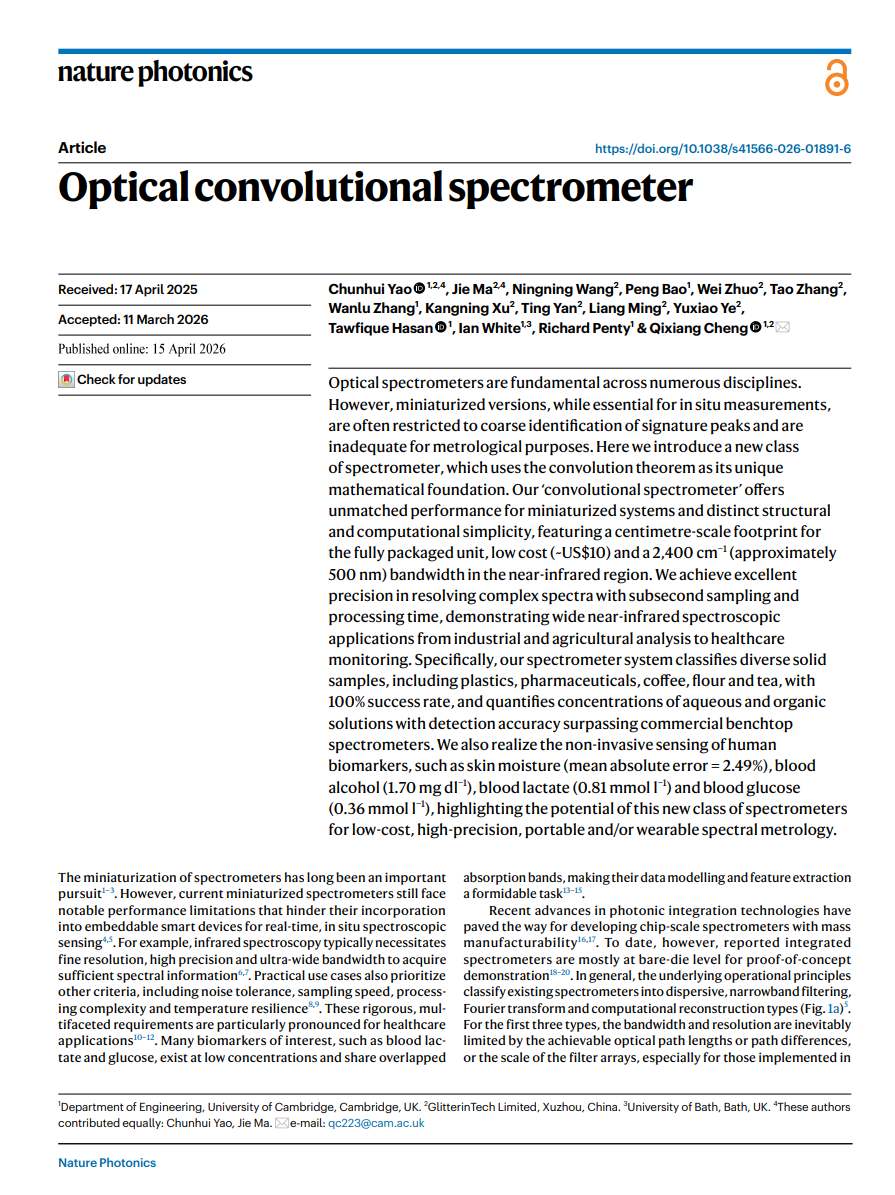 苹果公司没能搞定的无创血糖监测,正在一家中国公司手中加速走向现实 在物质分析与健康监测领域,光谱仪如同科学家和医生的“眼睛”,能精准揭示物体的化学成分与含量。然而,传统高性能光谱仪往往体积庞大、价格昂贵,且使用门槛高。无论是在工业场景中进行材料成分识别与含量检测,还是在医疗健康领域开展人体指标分析,通常都离不开复杂的采样流程、实验室送检,以及专业人员的操作和解读。 如果能把这枚“光谱之眼”浓缩到一