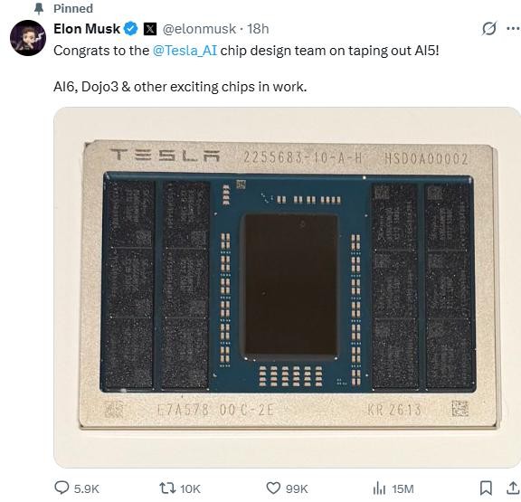 当地时间4月15日,特斯拉CEO马斯克在个人社交平台宣布,特斯拉芯片设计团队成功完成了下一代AI5自动驾驶芯片的流片,AI6、Dojo3和其他芯片正在研发之中。 在评论区中,马斯克同时点名感谢了三星和台积电。三星提供更具弹性的产能支撑和成本空间;台积电则提供先进制程能力,保证性能上限。 值得注意的是,马斯克发布的芯片照片上刻有“KR2613”字样。这个字样说明,这颗芯片于2026年第13周在三星电