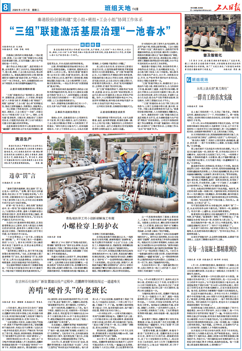 4月7日《工人日报》刊发专题报道《秦港股份创新构建“党小组+班组+工会小组”协同工作体系——“三组”联建激活基层治理“一池春水》从多角度深入解读秦港股份以党小组、班组、工会小组“三组”联建为核心构建“政治引领、生产驱动、人文关怀”一体工作体系推进基层治理创新实践的典型事迹中工网同步进行了转载引发广泛关注刊发内容如下全 文 如 下秦港股份创新构建“党小组+班组+工会小组”协同工作体系“三组”联建激活
