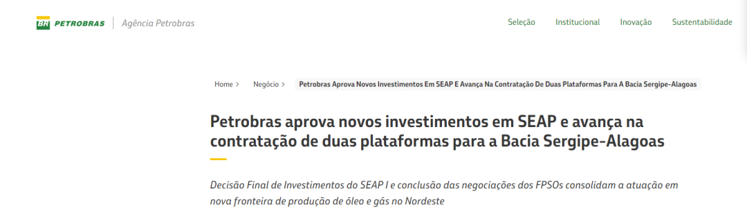 4月13日,巴西国家石油公司在其官网宣布,该公司已正式批准塞尔希培-阿拉戈斯盆地SEAP I项目的最终投资决策,加上去年12月巴国油已批准该区域SEAP II项目的最终投资决策,这使得塞尔希培-阿拉戈斯盆地深水油气开发项目终于正式敲定。该项目2座浮式生产储卸油装置(FPSO)工程有望在近期正式签约,两个项目的总价值预计将达到78亿美元(约合人民币530亿元)。巴国油官网消息截图两巨头合作已谈妥?巴