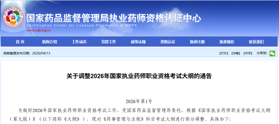 为做好2026年国家执业药师职业资格考试工作。国家药监局执业药师资格认证中心发布通告,对《药事管理与法规》科目考试大纲进行部分调整!今年考执业药师的考生,一起来了解下吧!2026年执业药师考试考试大纲调整为做好2026年国家执业药师职业资格考试工作,受国家药品监督管理局委托,根据《国家执业药师职业资格考试大纲(第九版)》(以下简称《大纲》),现对《药事管理与法规》科目考试大纲进行部分调整。2026