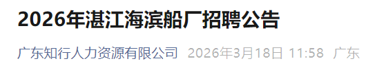 以下文章转载自广东知行人力资源有限公司一、企业概况湛江海滨船厂坐落于海滨名城湛江,始创于1960年,现有职工1400余人,是粤西地区最大的船舶修造企业,工厂拥有先进的生产设备设施,优质的船坞、船排、码头等,硬件设施完备精良。工厂连续30余年被省、市两级政府授予“守合同重信用先进单位”称号,广东省五一劳动奖状、广东省第四届厂务公开民主管理示范单位等多项殊荣。二、招聘条件(一)应聘人员需具备以下基本条