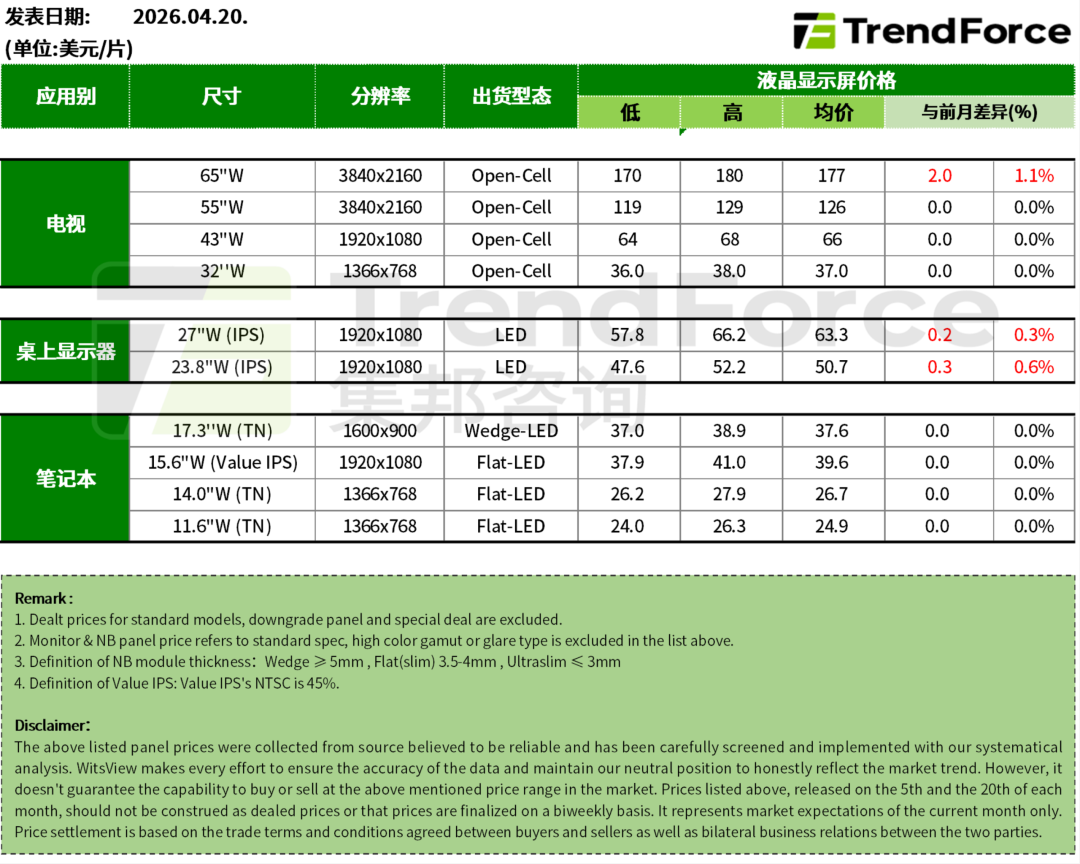 面板价格观察 - 4月4月20日,TrendForce集邦咨询公布了4月面板价格趋势:2026年4月,部分尺寸电视面板价格上调,显示器面板价格上涨,笔电面板价格持平。具体内容如下:1 电视面板 进入4月份后,虽然有部分品牌开始调整需求,但中国品牌客户目前仍保持对电视面板的需求,尤其是大尺寸面板需求。由于中小尺寸电视面板在存储器涨价影响下,成本调节的缓冲空间不足,导致需求动能放缓,因此尽管面板厂在面