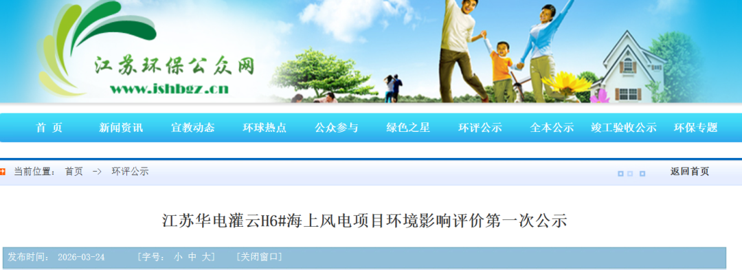 海上风电观察获悉,3月24日,江苏环保公众网发布《江苏华电灌云H6# 海上风电项目环境影响评价第一次公示》。根据公示,江苏华电灌云H6# 海上风电项目位于灌云海域、风电场中心离岸约34km;两回220kV送出海缆整体呈西南走向敷设至登陆点,并绕过周边其他海上风电场区;陆上集控中心位于灌西盐场滨海大道附近,华能灌云海上风电集控中心旁。该项目海上风电场区建设26台12.5MW风电机组,总装机规模325