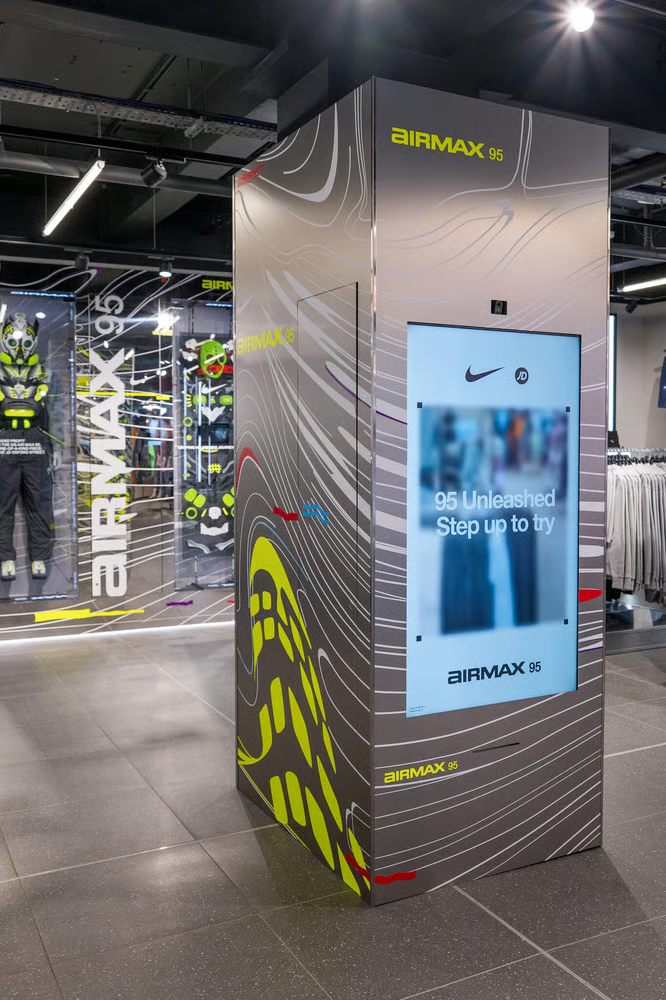 编译/VR陀螺 近日,耐克在其伦敦牛津街旗舰店推出了一项以球鞋文化与实验性设计为灵感的沉浸式AR镜体验。 该项目与智能镜面平台专家LOOOK.AI合作开发,并由FFFFACE.ME打造,创意源自创意团体Bubble Koppe设计的 “球鞋主题面罩概念”,将经典鞋款设计元素转化为可穿戴的数字视觉效果。 简单来说,消费者在JD旗舰店通过这面智能镜子,可实时改变镜中形象,虚拟试戴源自耐克球鞋美学的艺术