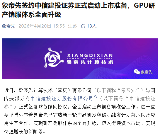 4月20日,国产GPU厂商象帝先计算技术(重庆)有限公司(以下简称“象帝先”)通过官方微信公众号宣布,近日已与国内头部券商中信建投证券股份有限公司(以下简称“中信建投证券”)正式签署财务顾问协议,全面启动IPO上市前各项准备工作。作为国内资本市场的头部券商,中信建投证券在半导体、集成电路等硬科技领域积累了丰富的辅导与保荐经验,此次双方携手,既是象帝先对上市工作的高度重视,也是对中信建投证券专业能力