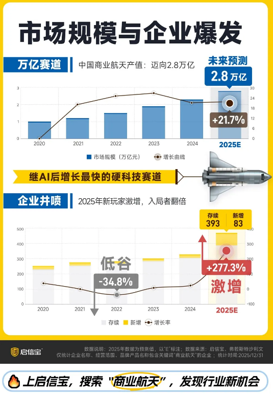 如果说AI产业在两年前迎来了“ChatGPT时刻”,那么此刻的商业航天,正处于产业爆发前的“iPhone时刻”。启信宝基于海量商业大数据发布的《2026商业航天行业观察报告》显示,火箭与卫星正褪去国家实验室昂贵玩具的标签,转型为大众可触及、能盈利的“太空基础设施”。 政策与市场双轮驱动,产值剑指2.8万亿 2025年成为中国商业航天的分水岭。随着“十五五”规划定调、国家航天局“商业航天司”设立以及