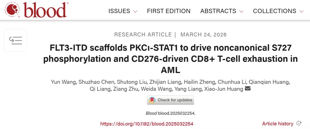 FLT3-ITD突变与急性髓细胞白血病(AML)的不良预后相关,但其激酶非依赖性机制尚不清楚。 2026年3月24日,北京大学黄晓军、中山大学梁洋、王韵共同通讯在Blood(IF=23.1)在线发表题为FLT3-ITD scaffolds PKCι-STAT1 to drive noncanonical S727 phosphorylation and CD276-driven CD8+ T-ce