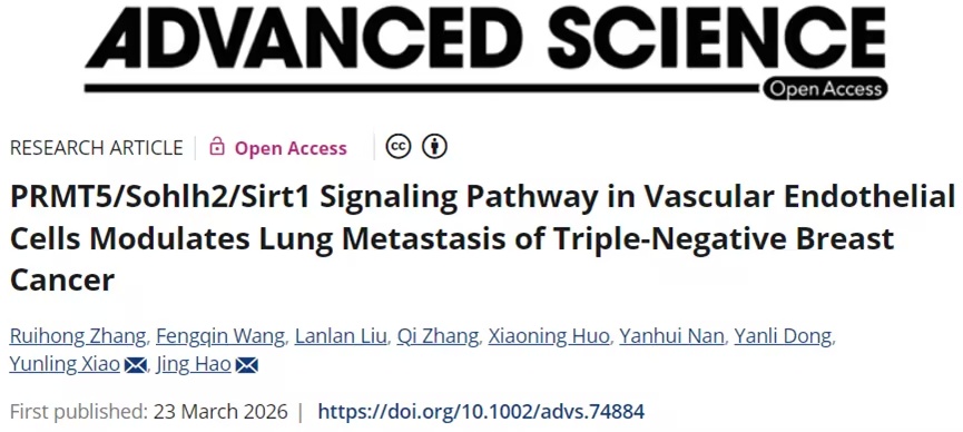 肺转移是三阴性乳腺癌(TNBC)患者死亡的主要原因。肿瘤细胞与血管内皮细胞(VECs)之间的相互作用在肿瘤转移过程中发挥关键作用。Sohlh2 是乳腺癌进展中已知的抑癌基因,但其在血管内皮细胞与肿瘤细胞交互作用中的功能尚不明确。 2026年3月23日,山东大学郝晶及肖云玲共同通讯在Advanced Science(IF=14.1)在线发表题为PRMT5/Sohlh2/Sirt1 Signaling