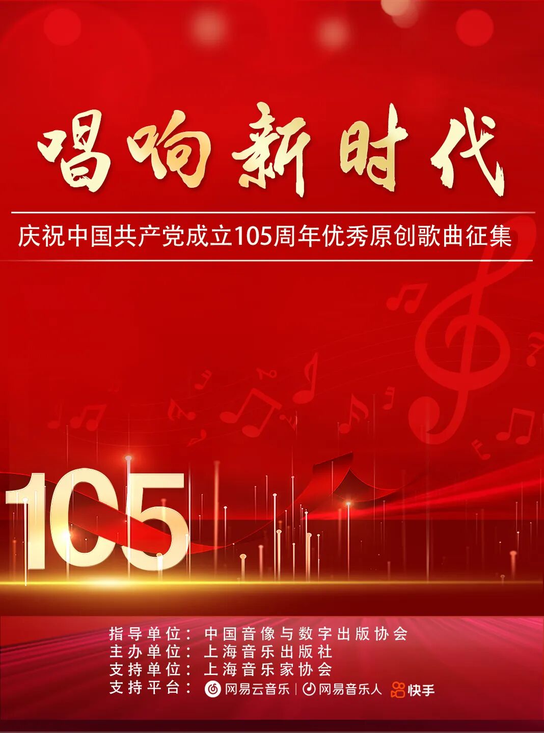 为热烈庆祝中国共产党成立 105 周年,用歌声铭记光辉历程、礼赞伟大时代,由中国音像与数字出版协会指导,上海音乐出版社主办,上海音乐家协会及网易云音乐、快手平台支持的“唱响新时代——庆祝中国共产党成立105周年优秀原创歌曲征集”活动,历经5轮次的专业评审,现正式遴选出105 首优秀歌曲!本次活动自启动以来,得到了全国各地音乐工作者的积极响应与热情参与,活动共征集到原创歌曲512首,作品来源覆盖我国