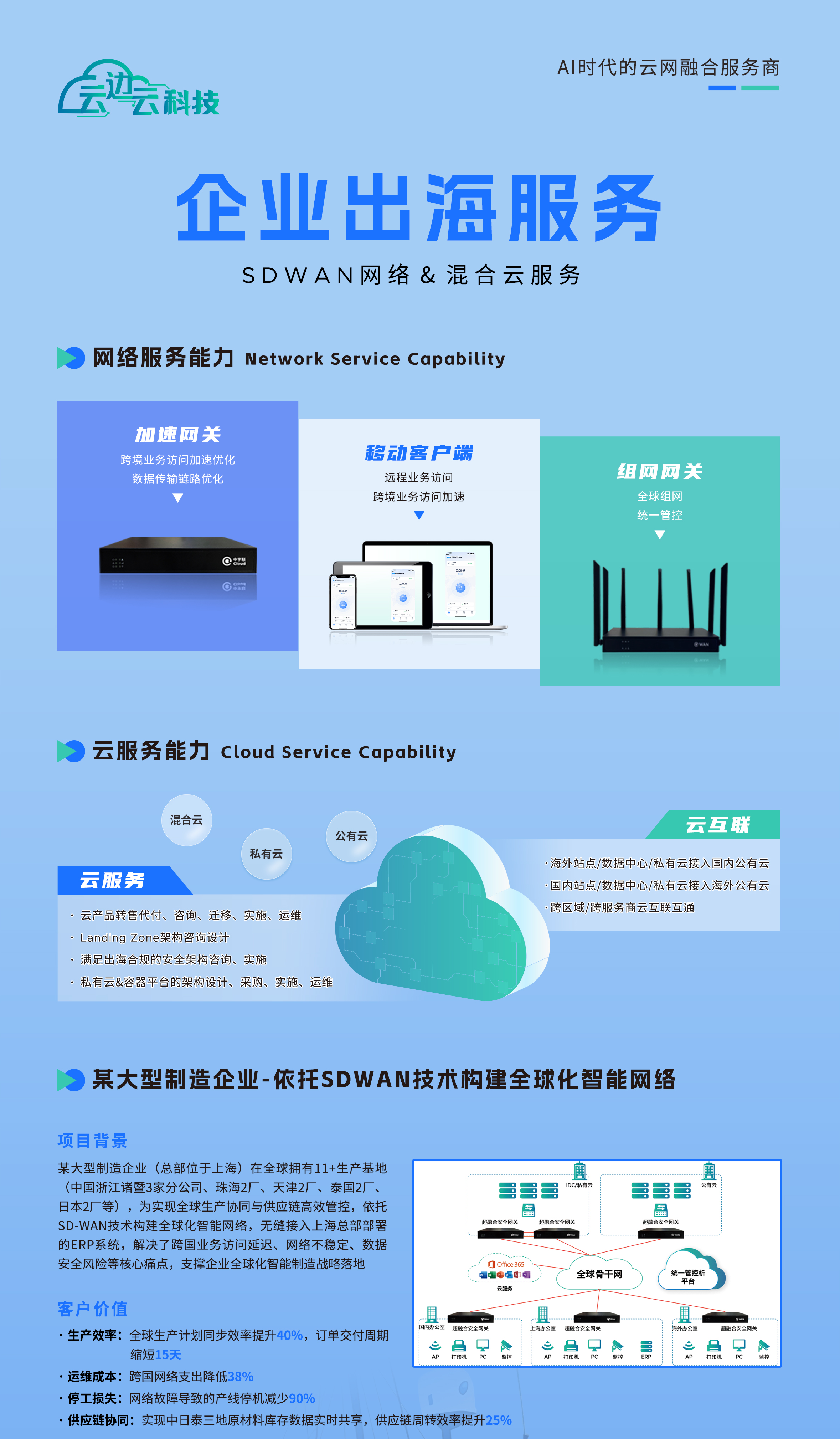 前言当您的业务迈向全球,是否正被这些问题困扰?跨国访问总部ERP,延迟高、卡顿频繁,影响生产效率海外与国内数据互通困难,供应链协同受阻多云环境(私有云/公有云)管理复杂,安全和合规风险高我们的解决方案:提供一站式 “网络+云” 服务能力,让您专注核心业务,全球化布局再无后顾之忧。一、网络服务能力——打通全球业务的“高速公路”加速网关 & 全球组网:为您的跨境业务访问、数据传输进行深度优化。无论是国