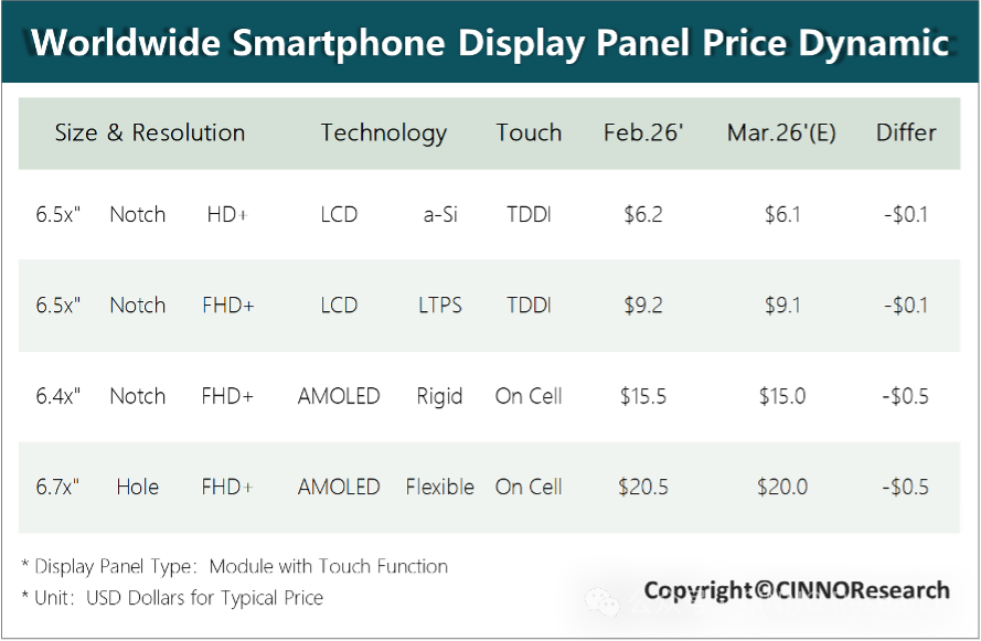 “进入3月,春节假期效应消退,手机面板市场仍面临严峻挑战。上游存储器及大宗原材料成本高企与下游终端采购谨慎情绪交织,各技术路线面板价格普遍承压。在“成本高企”与“需求疲软”的博弈中,买方议价能力显著增强,为争取有限订单,面板厂与模组厂延续“以价换量”策略,整体价格将继续下探。” CINNO Research 简评 01 进入3月,春节假期效应消退,手机面板市场仍面临严峻挑战。上游存储器及大宗原材料
