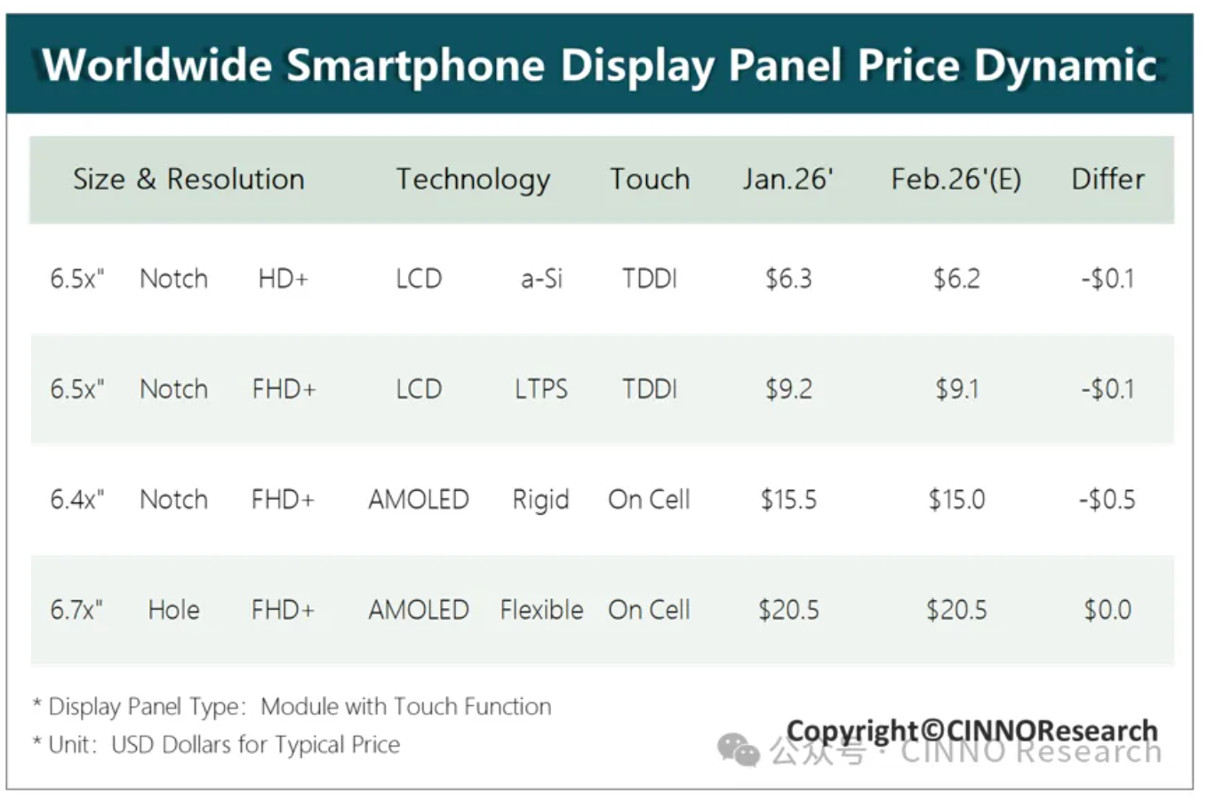 受春节假期及传统淡季影响,2026年2月手机市场整体表现低迷。与此同时,上游存储器价格持续大幅上涨,显著推高整机BOM成本,终端品牌纷纷下调出货目标以控制成本。在此背景下,手机面板市场延续疲软态势,各技术类型的手机面板价格均面临不同程度的下行压力。 CINNO Research 简评 01 受春节假期及传统淡季影响,2026年2月手机市场整体表现低迷。与此同时,上游存储器价格持续大幅上涨,显著推高