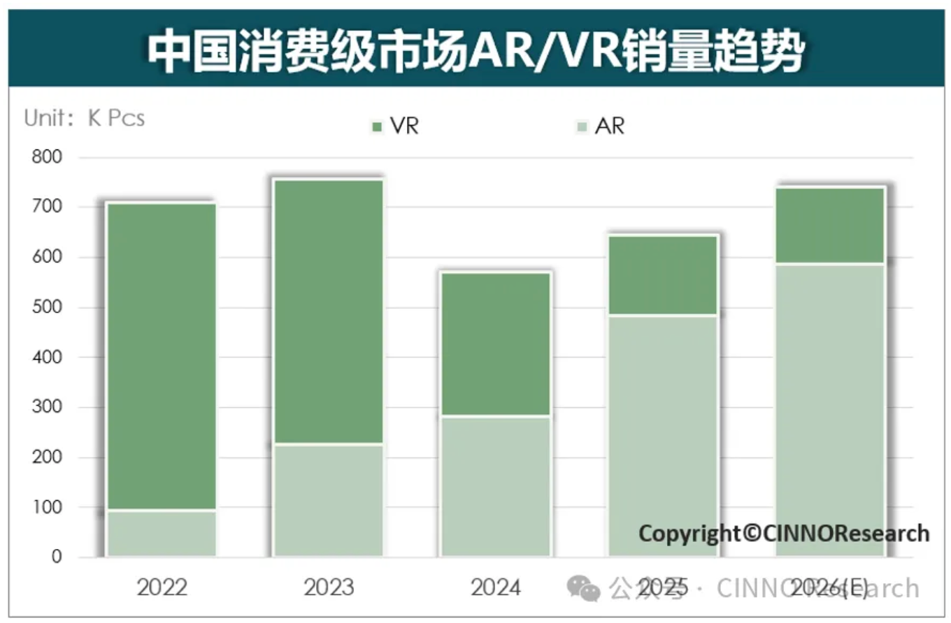 在产业链国产化突破与消费场景深度重构的双重驱动下,2025年中国消费级XR市场实现结构性跃升。CINNO Research监测数据显示,全年消费级总销量达64.5万台,同比增长13%,AR以48万台销量首次超越VR。 CINNO Research 简评 图示:2022-2026年中国消费级市场AR/VR销售趋势,来源:CINNO Research 2026年市场呈现二元性,虽技术进一步成熟成本下降