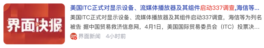 当地时间2026年4月1日,美国国际贸易委员会(USITC)通过投票决议,正式对特定显示设备、流媒体播放器及其相关组件启动337调查,案件编号为337-TA-1496,此次调查直指多家中、美、墨三国企业,其中海信集团、紫标传媒相关关联企业均在列,凸显美国在消费电子领域对中国企业的密集打压态势。据悉,本次调查的发起源于美国内华达州拉斯维加斯的InnoTV Labs, LLC公司的申诉。该公司于202