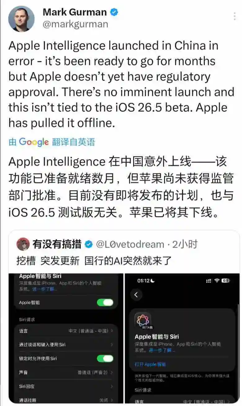 凤凰网科技讯 3月31日,苹果于今日凌晨开始分批推送国行Apple Intelligence Beta版,需升级至iOS 26.4及以上系统方可体验。彭博社记者马克·古尔曼今日发文称Apple Intelligence在中国属于意外上线,目前没有即将发布的计划,苹果已将其下线。古尔曼还表示,以下几点迹象表明这是一个意外:1) 苹果不会在没有发布公告的情况下在其最重要的市场推出人工智能。2) 苹果不