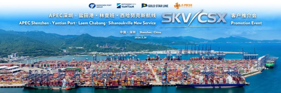 3月26日深圳港集团献礼APEC港航系列活动首场商务活动盐田·林查班·西哈努克航线首航仪式暨客户推介会在深圳成功举办有效巩固深圳港国际中转枢纽港地位深化深圳与APEC经济体互联互通盐田·林查班·西哈努克航线由香港金星轮船有限公司和X-press(凯祺瑞达(上海)海运有限公司)携手运营。该航线为周班制,由运营双方投入2艘船舶,为东南亚至北美长线货物提供快速、优质的转运时间,也为粤港澳大湾区企业开拓东