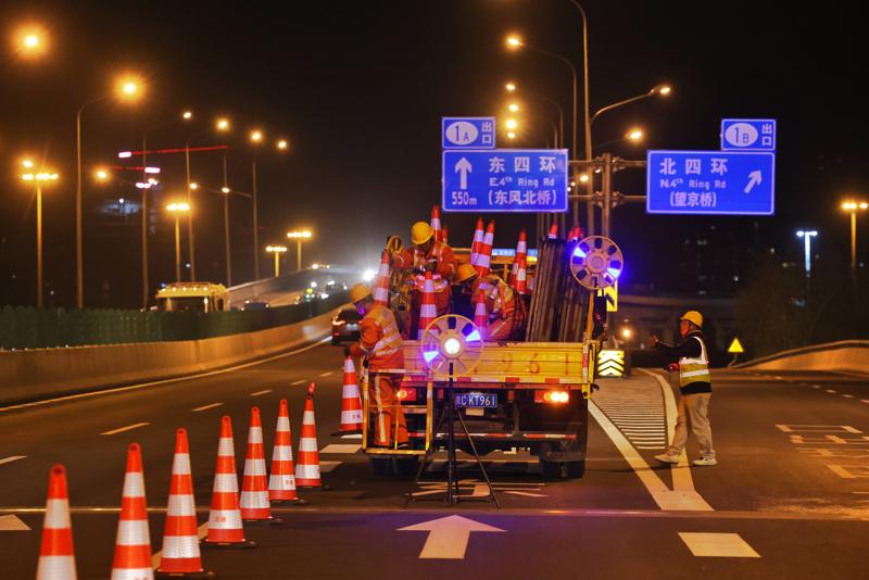 新京报讯(记者裴剑飞)今天(4月11日)凌晨,北京市四元立交桥系混凝土铺装层翻建修复工程启动。记者在现场看到,施工开始后,工作人员迅速导行车辆、封闭出入口封闭,约300台套施工机械设备驶入京密快速路连接四元桥的两条匝道桥。本周末48小时内,作为四环桥系修复“手术”的第一阶段工程,两条匝道桥将完成翻新。4月11日凌晨,北京市四元立交桥系混凝土铺装层翻建修复工程启动。新京报记者 王贵彬 摄记者从北京市
