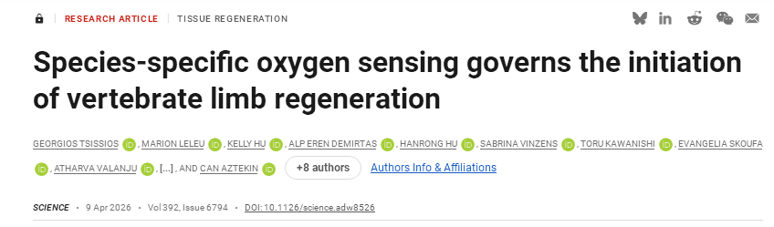 “我们对研究结果感到非常兴奋,我们为这个困扰人们几个世纪的问题带来了全新的视角。我们的研究结果表明,哺乳动物组织中的再生程序可以被激活,并开始勾勒出一条清晰、可验证的途径,以促进成年哺乳动物的肢体再生。”瑞士洛桑联邦理工学院 (EPFL) 的研究人员发现,氧气感知可以解释为什么两栖动物能够再生肢体而哺乳动物不能。有些动物可以再生失去的身体部位。蝾螈和蛙蝌蚪在截肢后可以重建整个肢体。哺乳动物则不能。