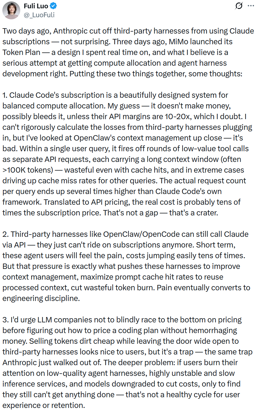 感谢IT之家网友 会弹琴的九号 的线索投递! IT之家 4 月 7 日消息,小米集团 MiMo 负责人罗福莉昨天在 X 平台发文,谈及最近 AI 业界火热的 Token(IT之家注:词元)价格战。▲ 图源:罗福莉本人社媒账号罗福莉表示,Anthropic 几天前切断了 Claude 第三方工具订阅通道;并且 MiMo 也在几天前推出了 Token Plan,于是她有感而发:1、Claude Cod