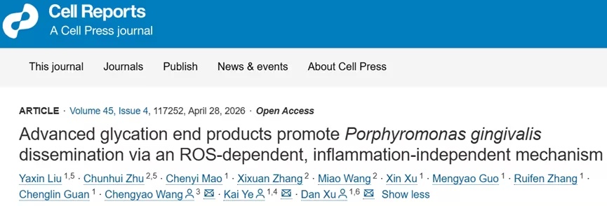 牙龈卟啉单胞菌(P. gingivalis)是一种机会致病性牙周病原体,其与多种系统性疾病的关联日益受到关注,但目前其播散机制尚不清楚。 2026年4月8日,西安交通大学许丹、叶凯、王澄瑶共同通讯在Cell Reports 在线发表题为Advanced glycation end products promote Porphyromonas gingivalis dissemination via