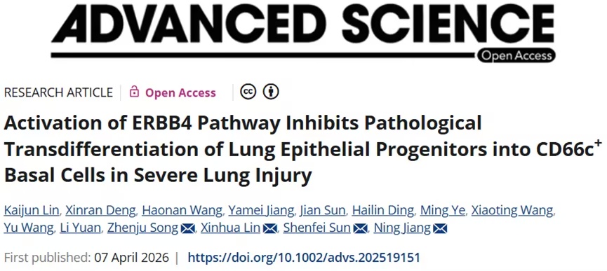 远端肺组织中基底细胞异常聚集,是上皮再生受损的典型特征,并与纤维化重塑密切相关;然而,这类细胞的来源及调控其增殖扩张的机制仍不明确。 2026年4月7日,复旦大学姜宁、孙申飞、林鑫华、宋振举共同通讯在Advanced Science(IF=14.1)在线发表题为Activation of ERBB4 Pathway Inhibits Pathological Transdifferentiatio