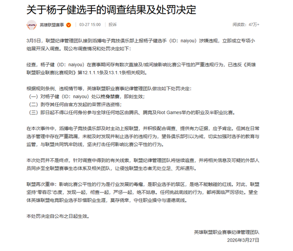 快科技3月27日消息,TES打野选手杨子健(ID:naiyou)LPL假赛风波尘埃落定。 今日,英雄联盟赛事官方通报,经查,杨子健在赛事期间存有数次直接及/或间接影响比赛公平性的严重违规行为,已违反《英雄联盟职业联赛比赛规则》第12.1.1.1条及13.1.1条相关规则。 根据规则条例、违规情节等,英雄联盟职业赛事纪律管理团队做出如下处罚决定: (一)对杨子健(ID:naiyou)处以终身禁赛,即